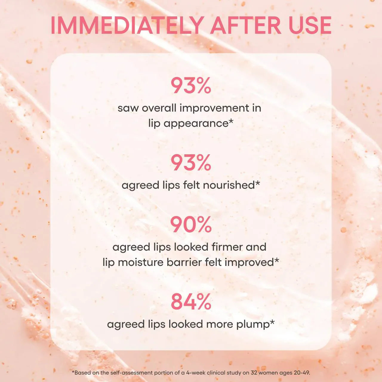 - 93% saw overall improvement in lip appearance and agreed lips felt nourished
