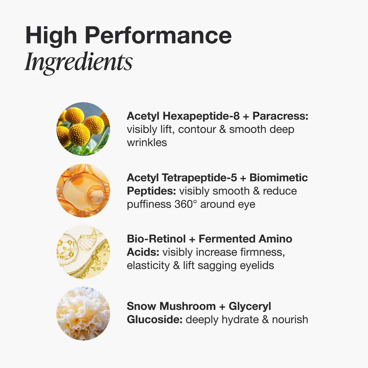 - Bio-Retinol and Fermented Amino Acids: Increase the appearance of firmness and elasticity and visibly lift sagging eyelids.