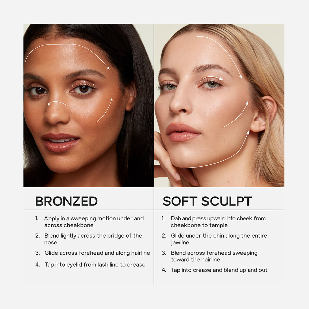 - For a natural sun-kissed bronze, blend and buff onto areas where the sun naturally hits, such as cheekbones, bridge of the nose, temples, and forehead.
