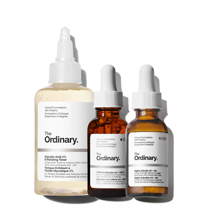 - Includes: Glycolic Acid 7 % Exfoliating Toner (100 ml), Alpha Arbutin 2 % + HA (30 ml), Caffeine Solution 5 % + EGCG (30 ml)